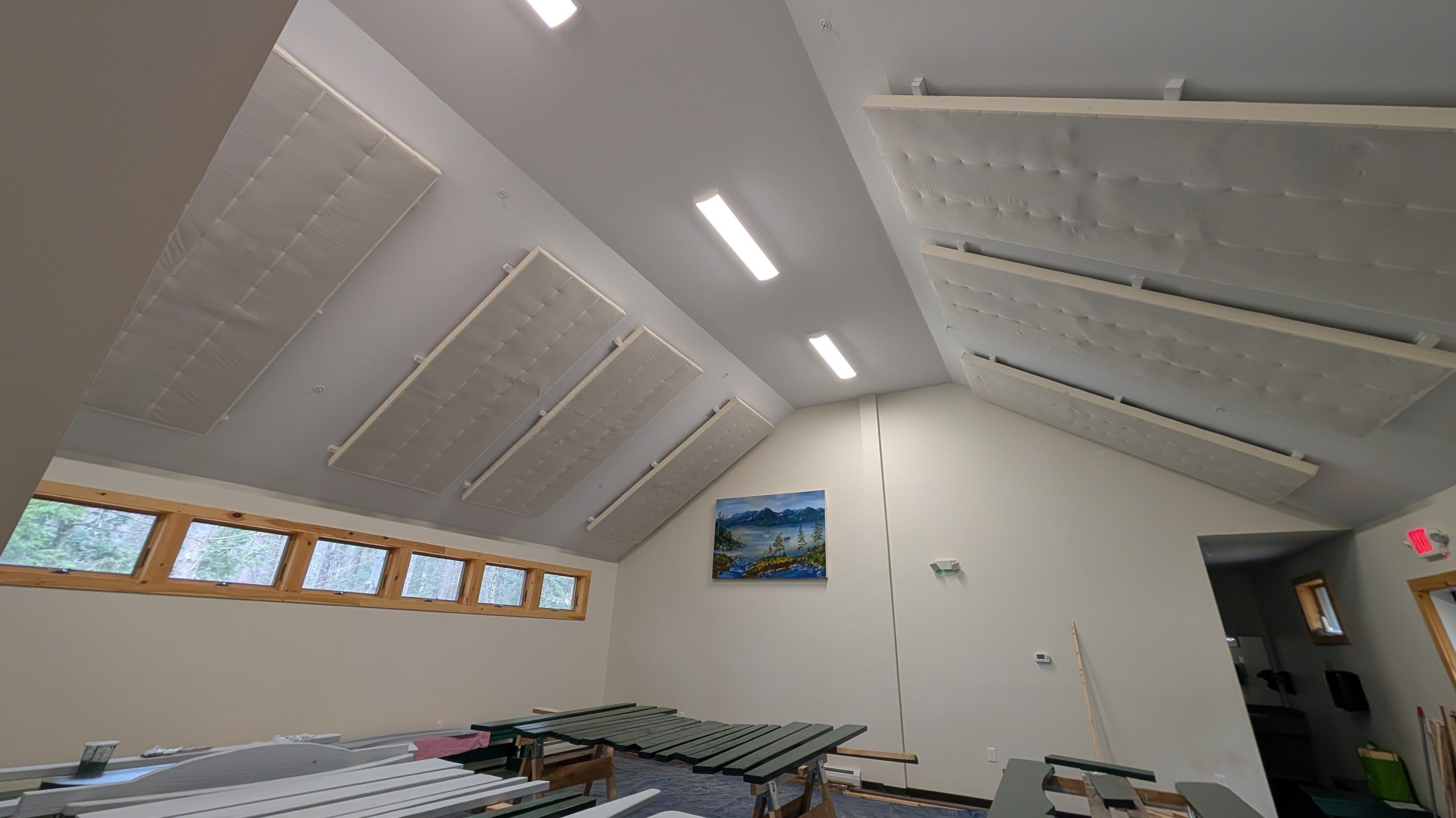 The sound baffles we highlighted last month have been fully installed in Conklin Lodge! These should help decrease the echoes in this flexible program space.