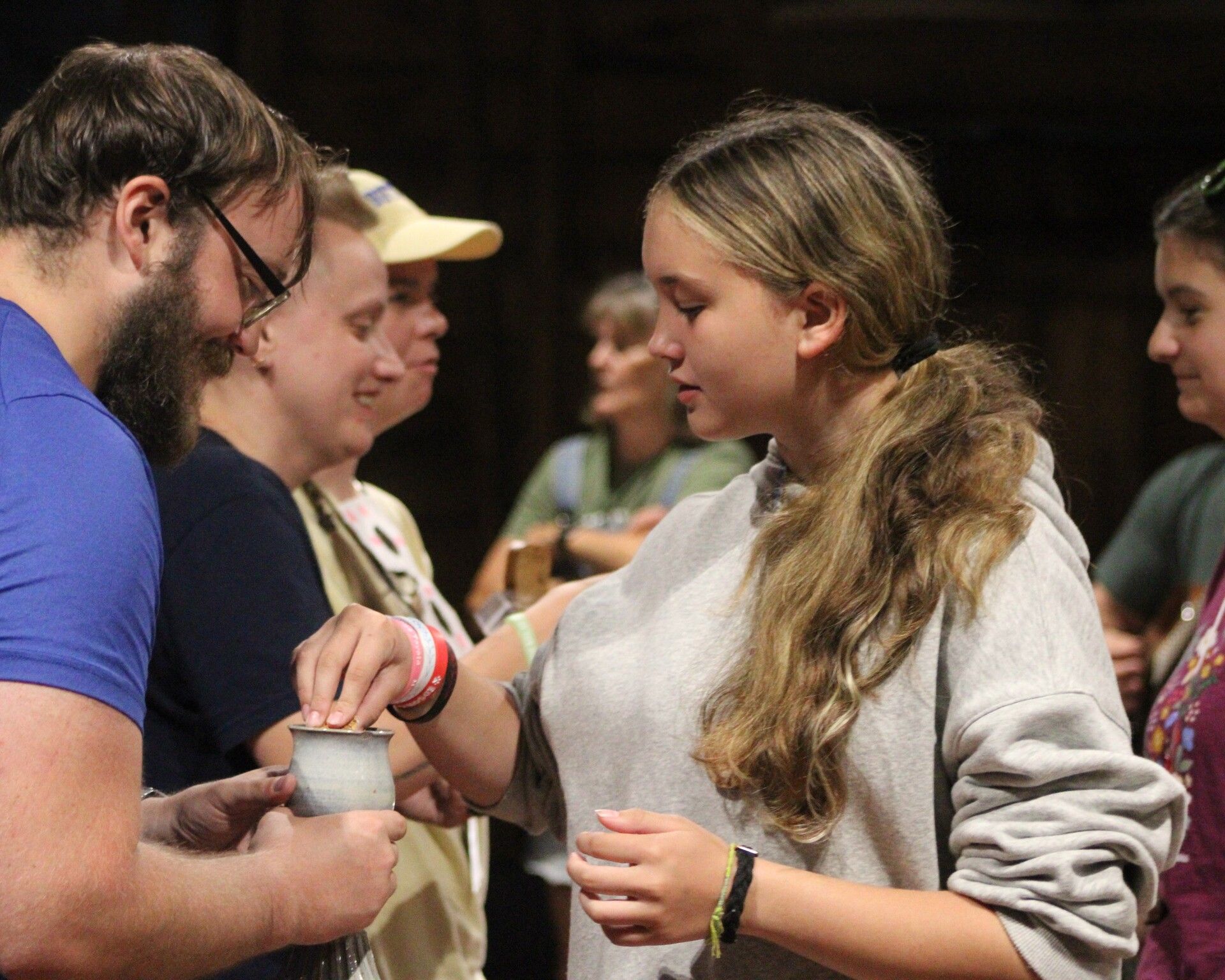 Handing out “pocket Jesus” tokens to campers during Thursday worship